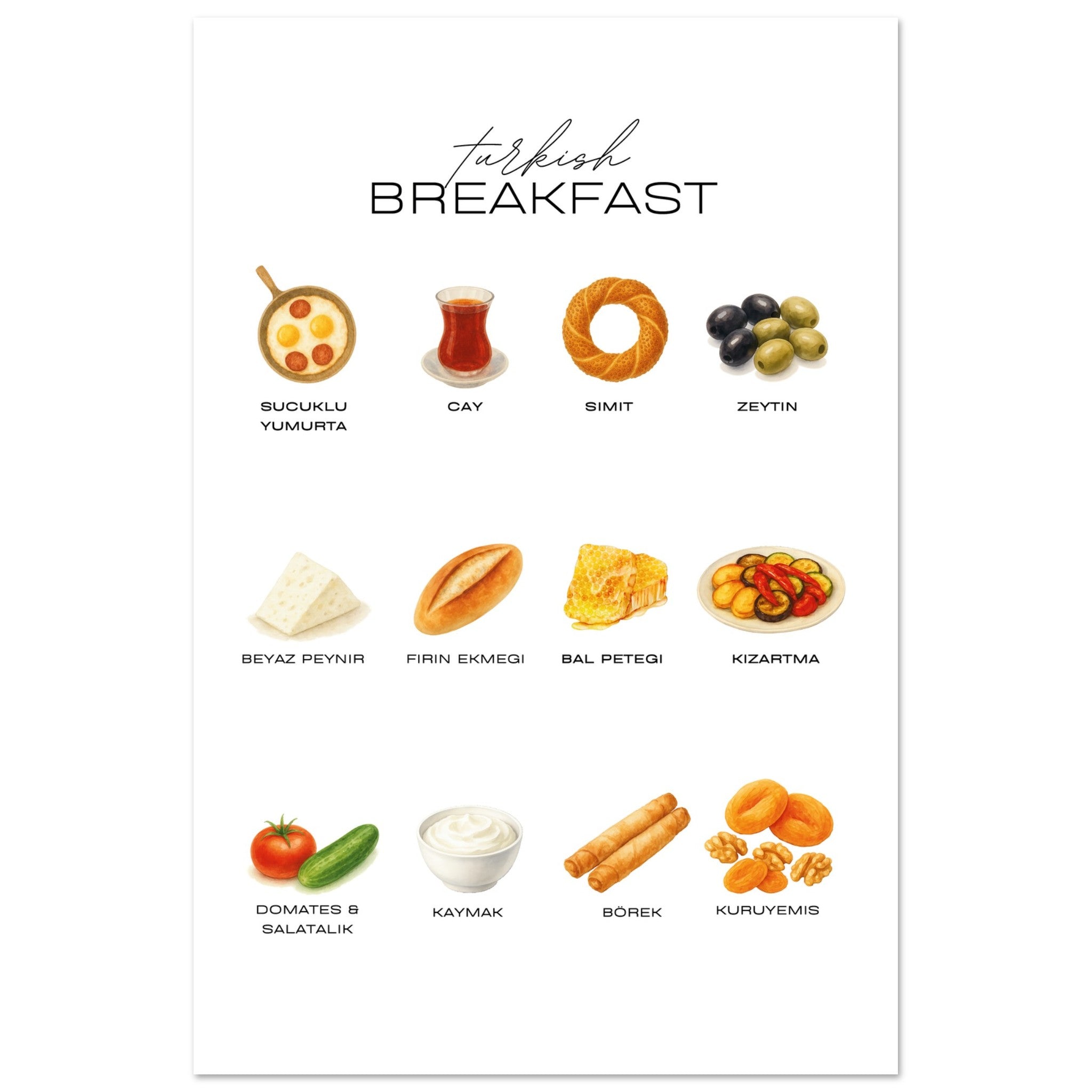 Kreieren Sie eine einladende Atmosphäre in Ihrer Küche mit unserem Türkisches Frühstück Poster! Diese wunderschöne Liste zeigt die köstlichsten türkischen Frühstücksgerichte und ist eine ideale Ergänzung für jeden Küchenraum.