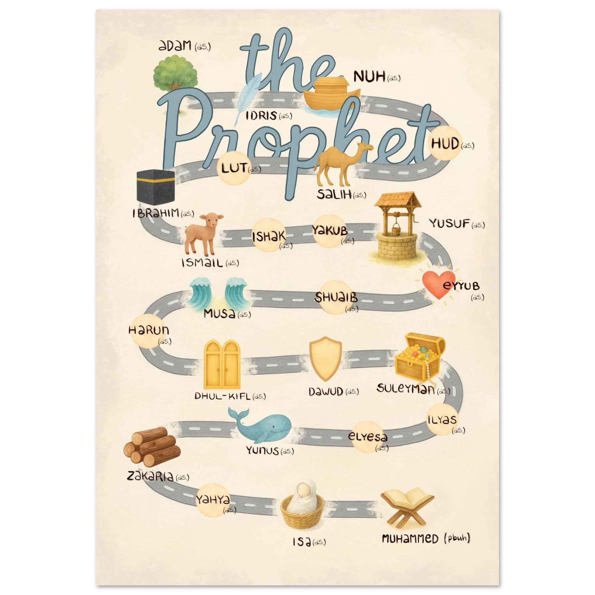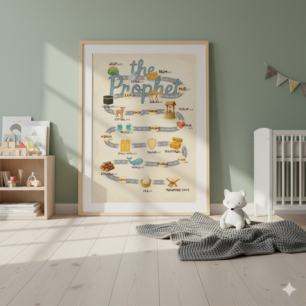 Verwandeln Sie den Lernraum Ihres Kindes mit unserem einzigartigen, digital handgemachten Kartenplakat, das die Reise vom ersten bis zum letzten Propheten zeigt. Dieses lebendige und lehrreiche Dekor ist perfekt für Kindergartenräume und macht das Lernen über wichtige religiöse Figuren sowohl unterhaltsam als auch visuell ansprechend!